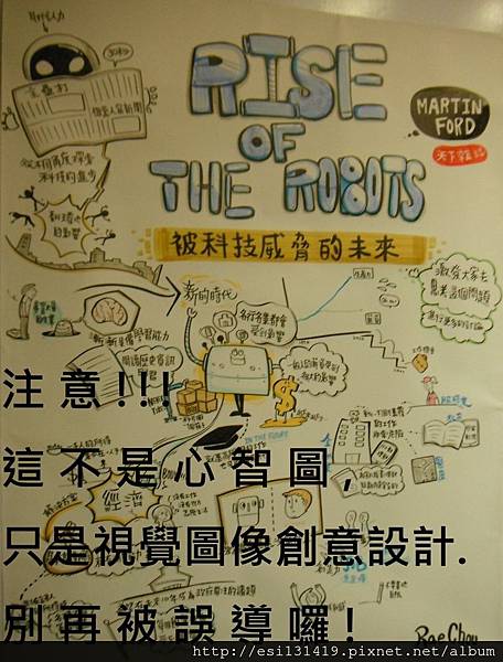 創作者答:我只是就聽到的內容,憑我的直覺所產生的畫面直接畫下來,我確實是看過有人在心智圖(mind map)上也畫上一些插圖。但我畫的並不是像心智圖(mind map)那樣有脈絡與邏輯性,這只是視覺藝術創作。
